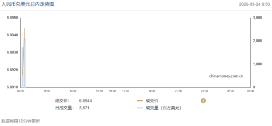 今日(3月24日),人民币兑美元中间价较前升值98个基点,报6.8943。在岸市场人民币兑美元即期汇率开盘价报6.8890,其后人民币呈震荡走势。离岸市场人民币兑美元开盘价报6.8844。